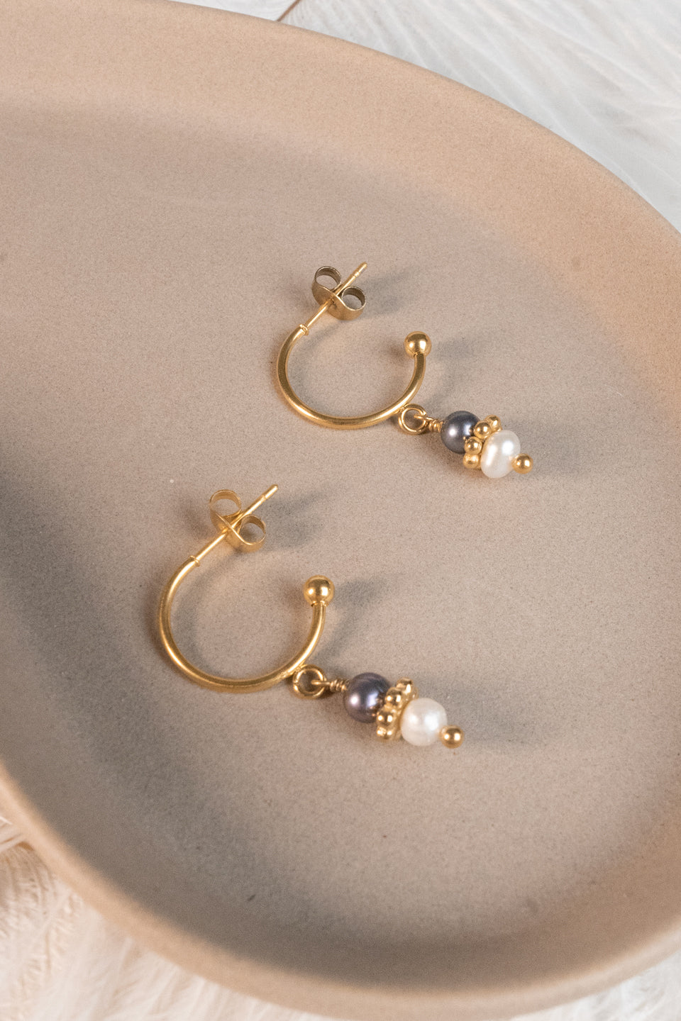 Les mini créoles Tisha sont fabriquées à la main dans mon atelier, Elles sont ornées d’un pendent décoré de Perles d’eau douce blanches et grise et d’une perle dorée,Disponible à l’unité ou en paire,Pour un style affirmé, dépareillez vos boucles en les associant à d’autres boucles SIKA,