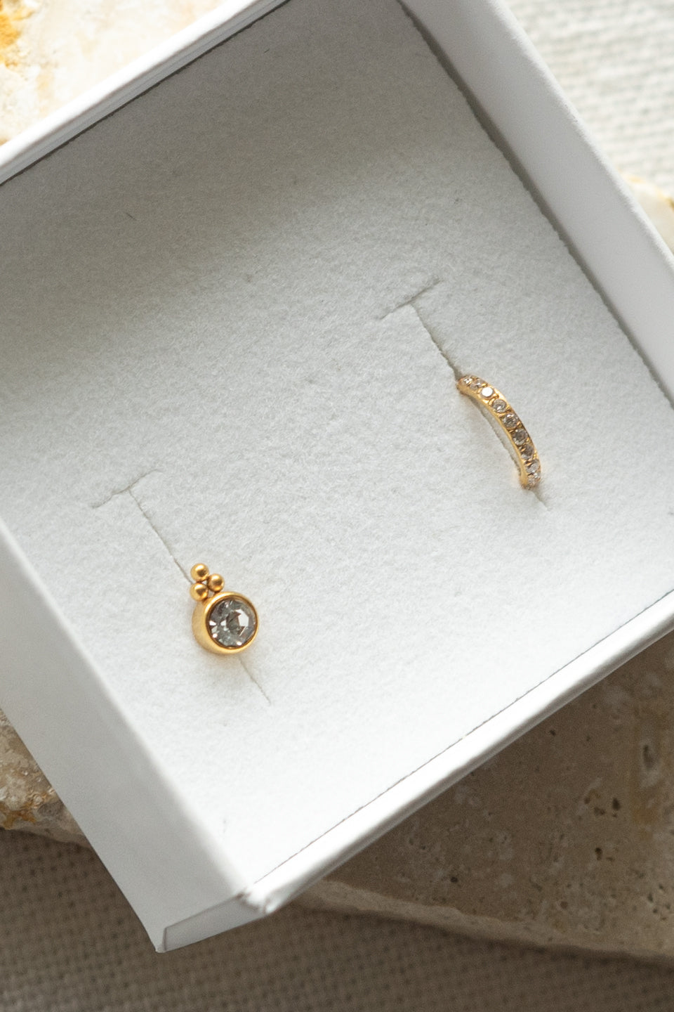 Le piercing Anais n'est pas fabriqué dans mon atelier mais par un fournisseur sous-traitant de SIKA sélectionné pour ces prestations de qualité, Il est orné d'un strass blanc et surmonté de trois petites billes dorées,