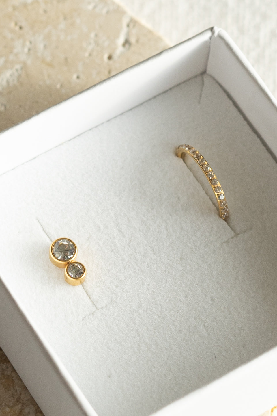 Le piercing Dina n'est pas fabriqué dans mon atelier mais par un fournisseur sous-traitant de SIKA sélectionné pour ces prestations de qualité, Il est orné de deux strass ronds blancs,