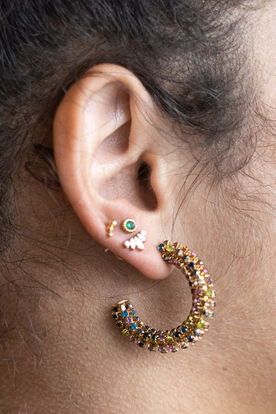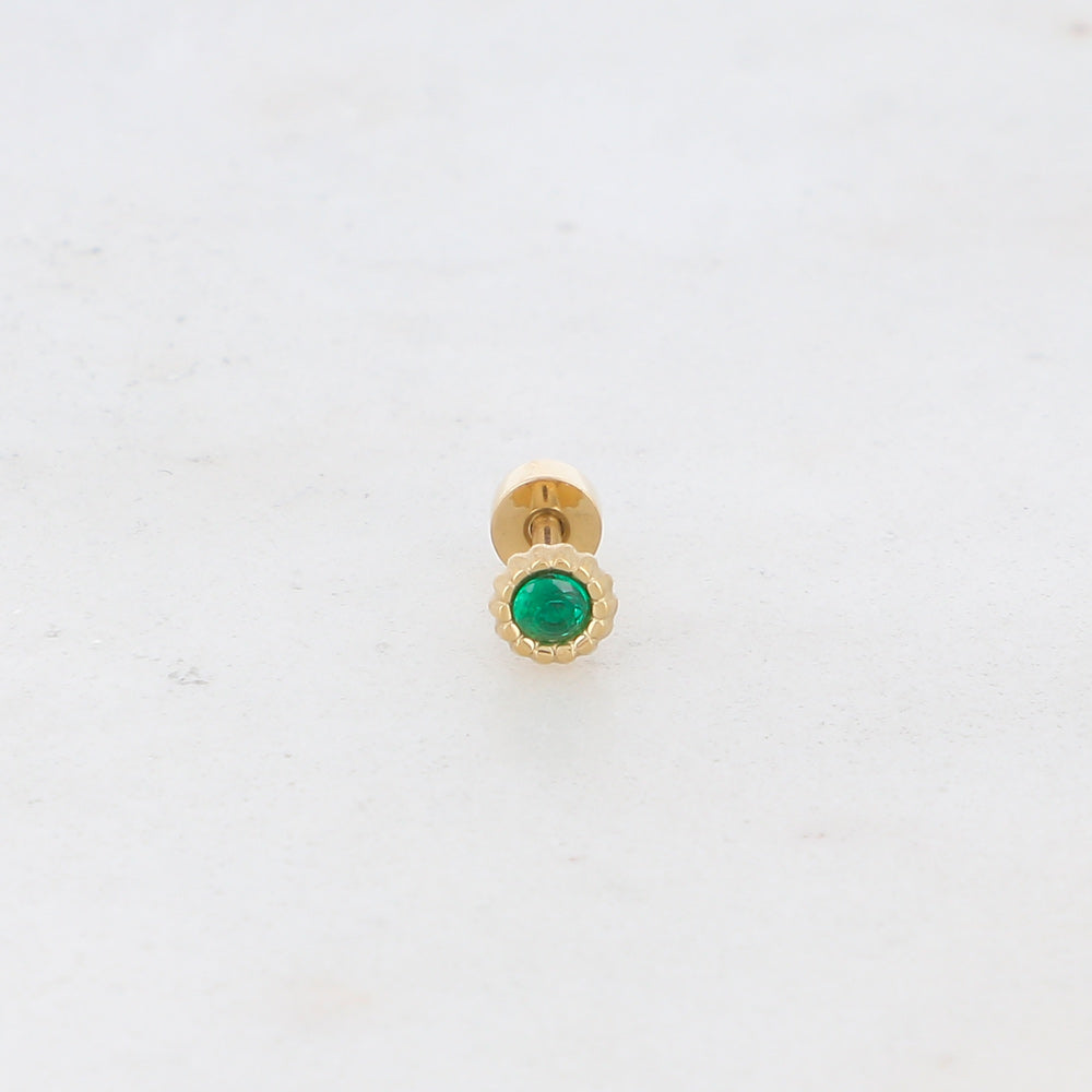 Le piercing Hélène n'est pas fabriqué dans mon atelier mais par un fournisseur sous-traitant de SIKA sélectionné pour ces prestations de qualité, Il est orné d'un strass rond vert entouré d'une multitude de petites billes dorés,