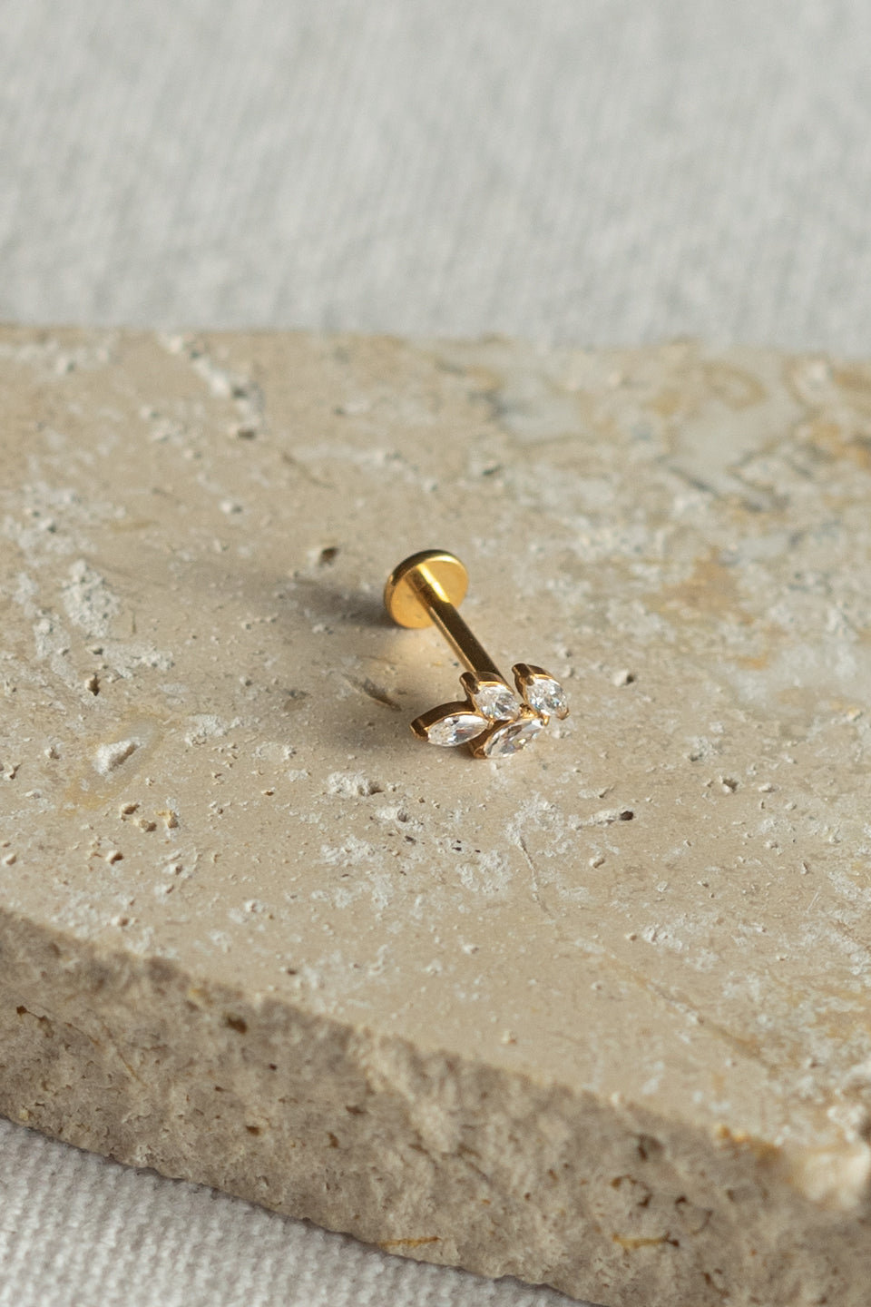 Le piercing Hoja n'est pas fabriqué dans mon atelier mais par un fournisseur sous-traitant de SIKA sélectionné pour ces prestations de qualité, Il est orné de 4 strass formant un motif de feuille,