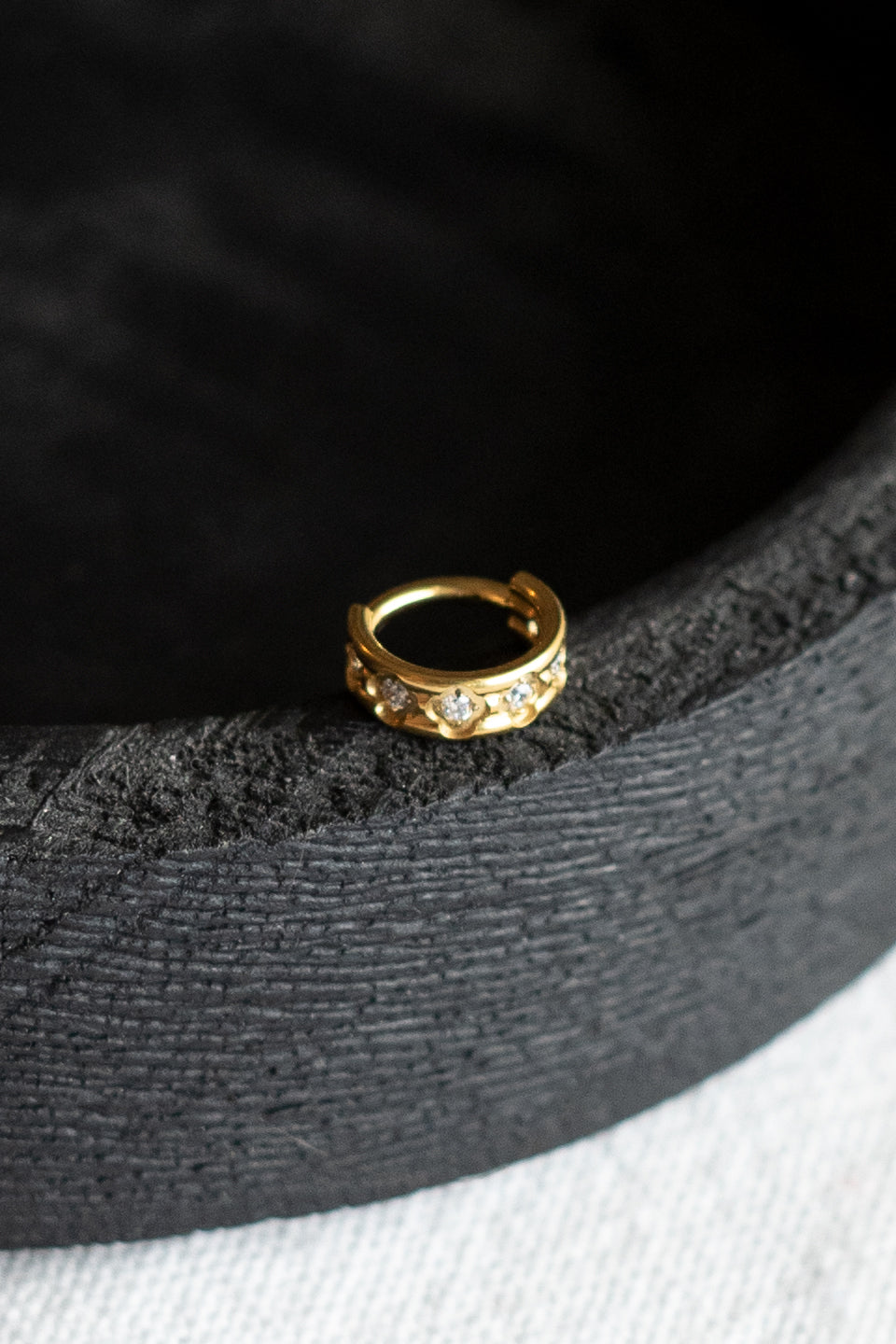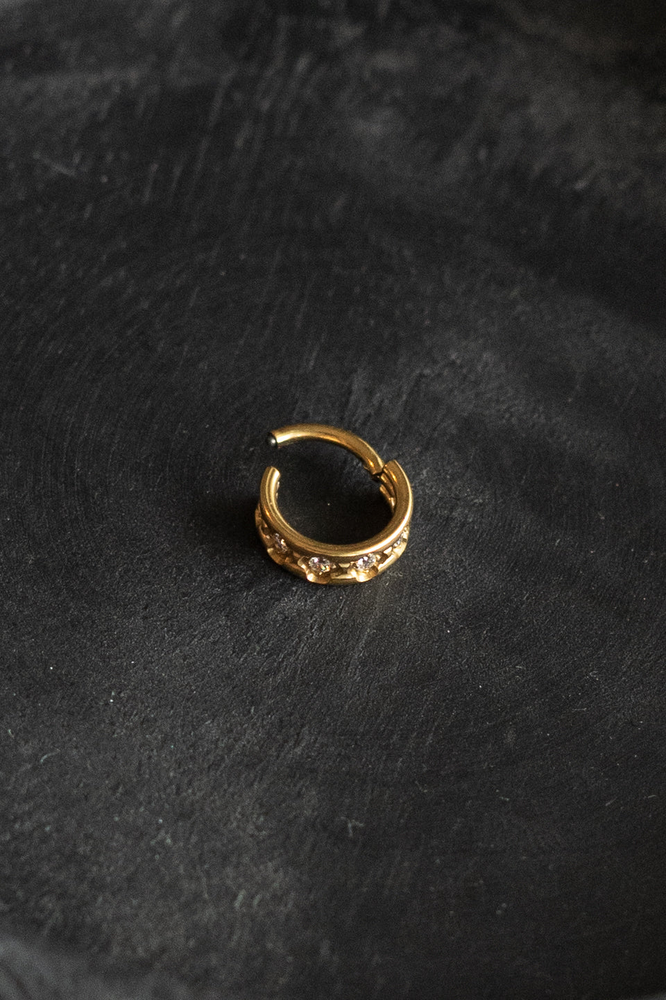 Le piercing Indi n'est pas fabriqué dans mon atelier mais par un fournisseur sous-traitant de SIKA sélectionné pour ces prestations de qualité, L'anneau de la créole orné de motifs représentant des tréfles et incrusté de strass blancs,