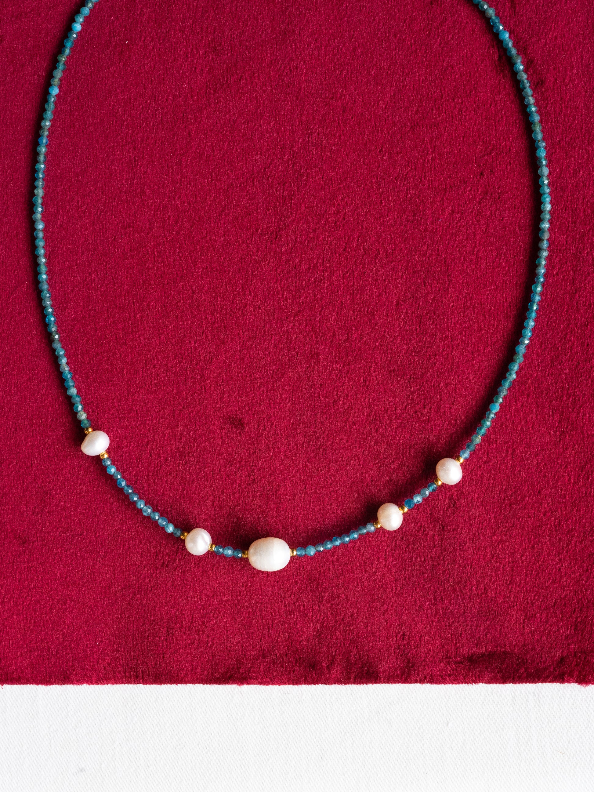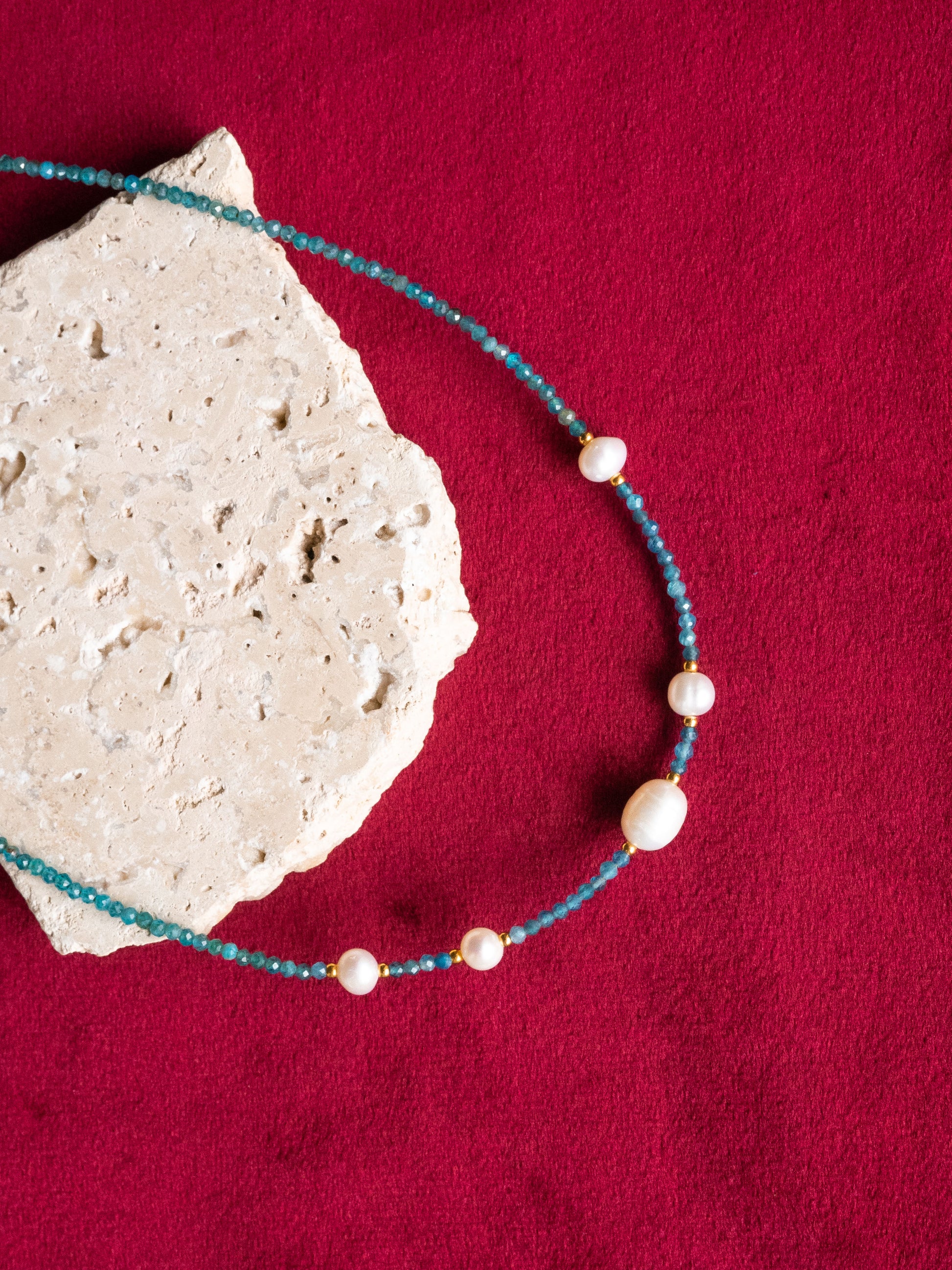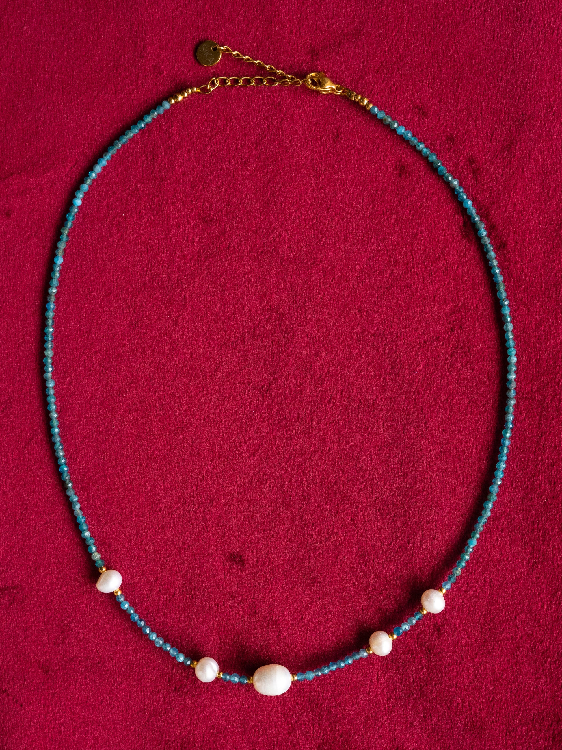 Le ras de cou Cassian est fabriqué à la main dans mon atelier. Il est composé d'Apatite ocres, de Perles d'eau douce et de quelques perles dorées.