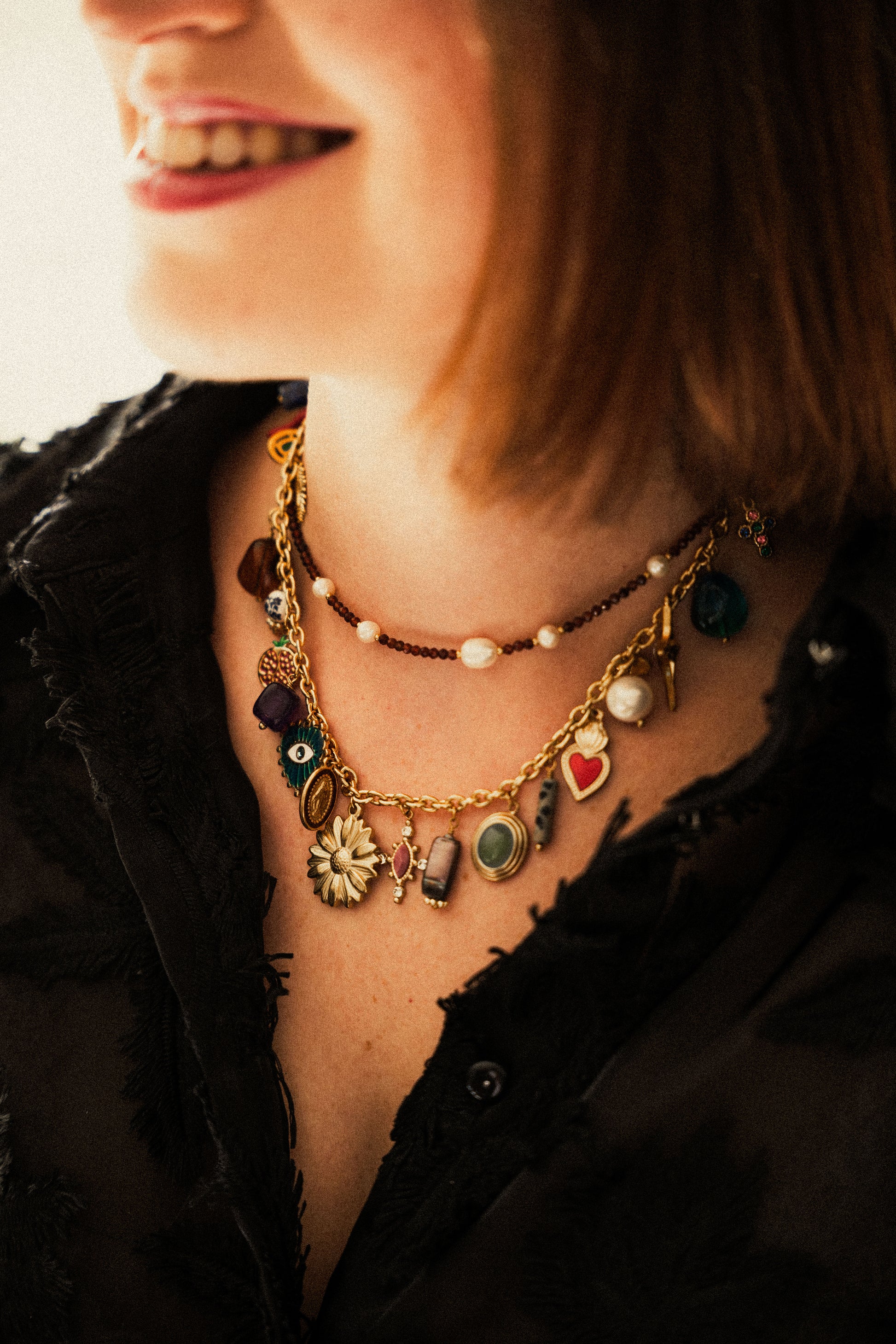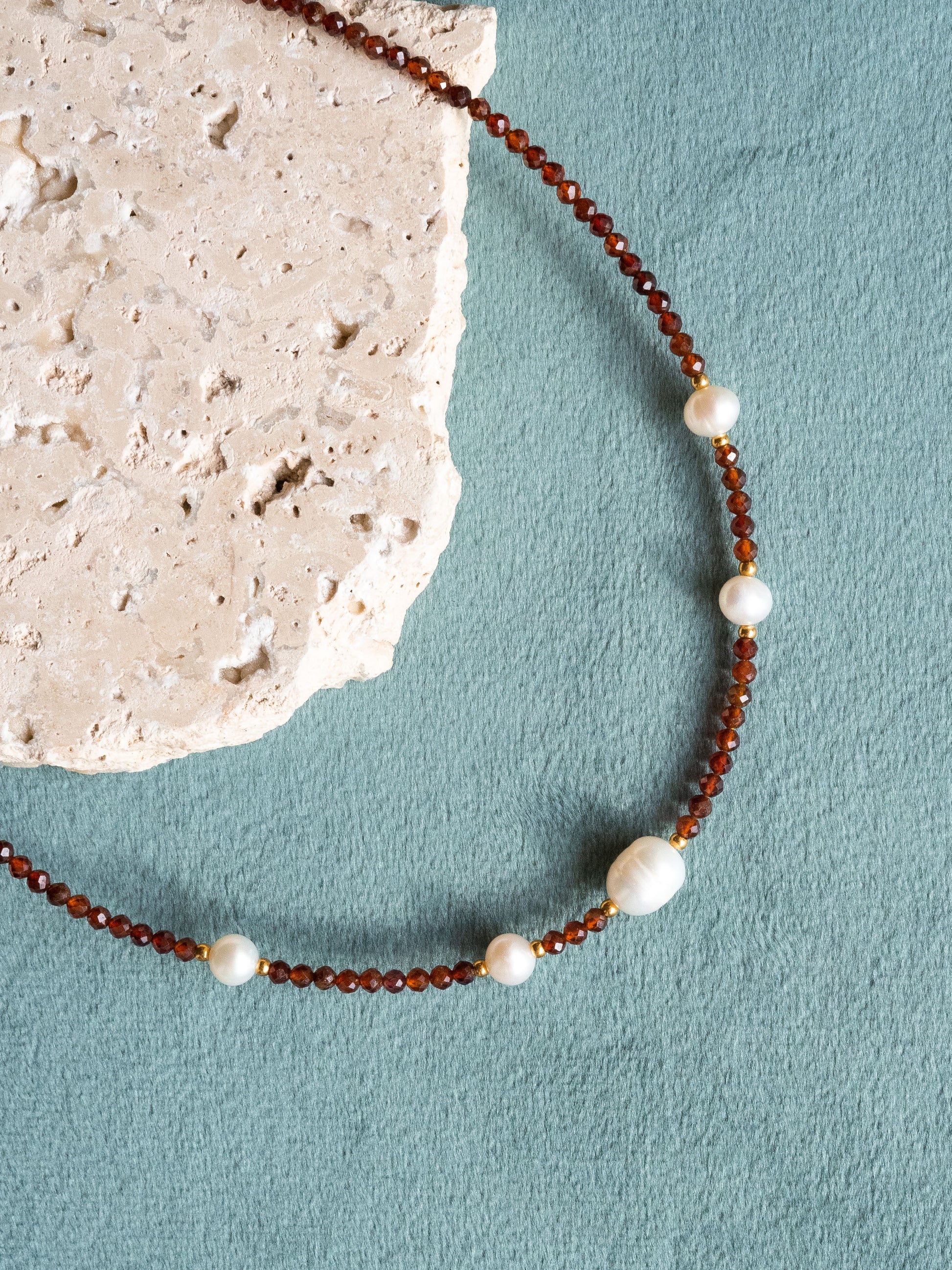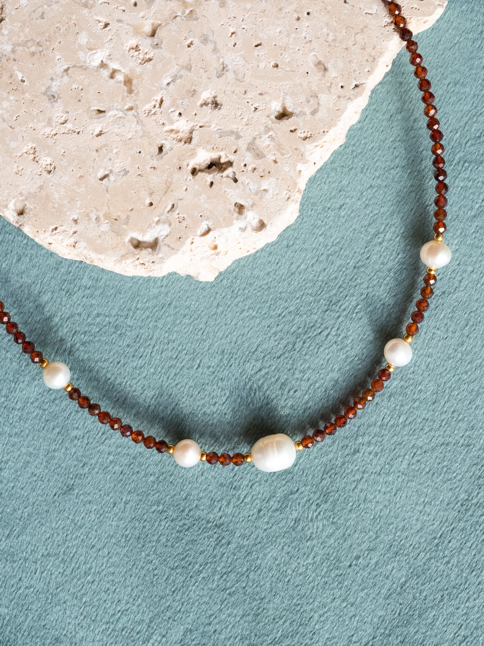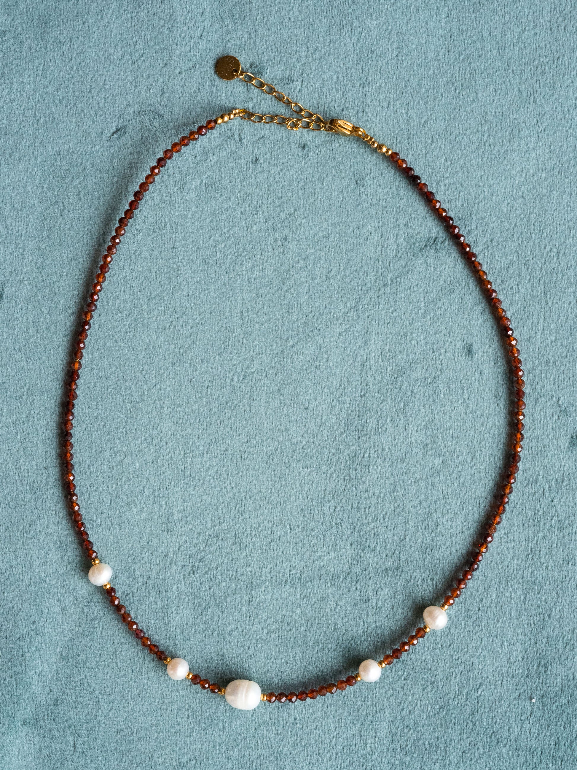 Le ras de cou Cassian est fabriqué à la main dans mon atelier. Il est composé de Grenats ocres, de Perles d'eau douce et de quelques perles dorées.