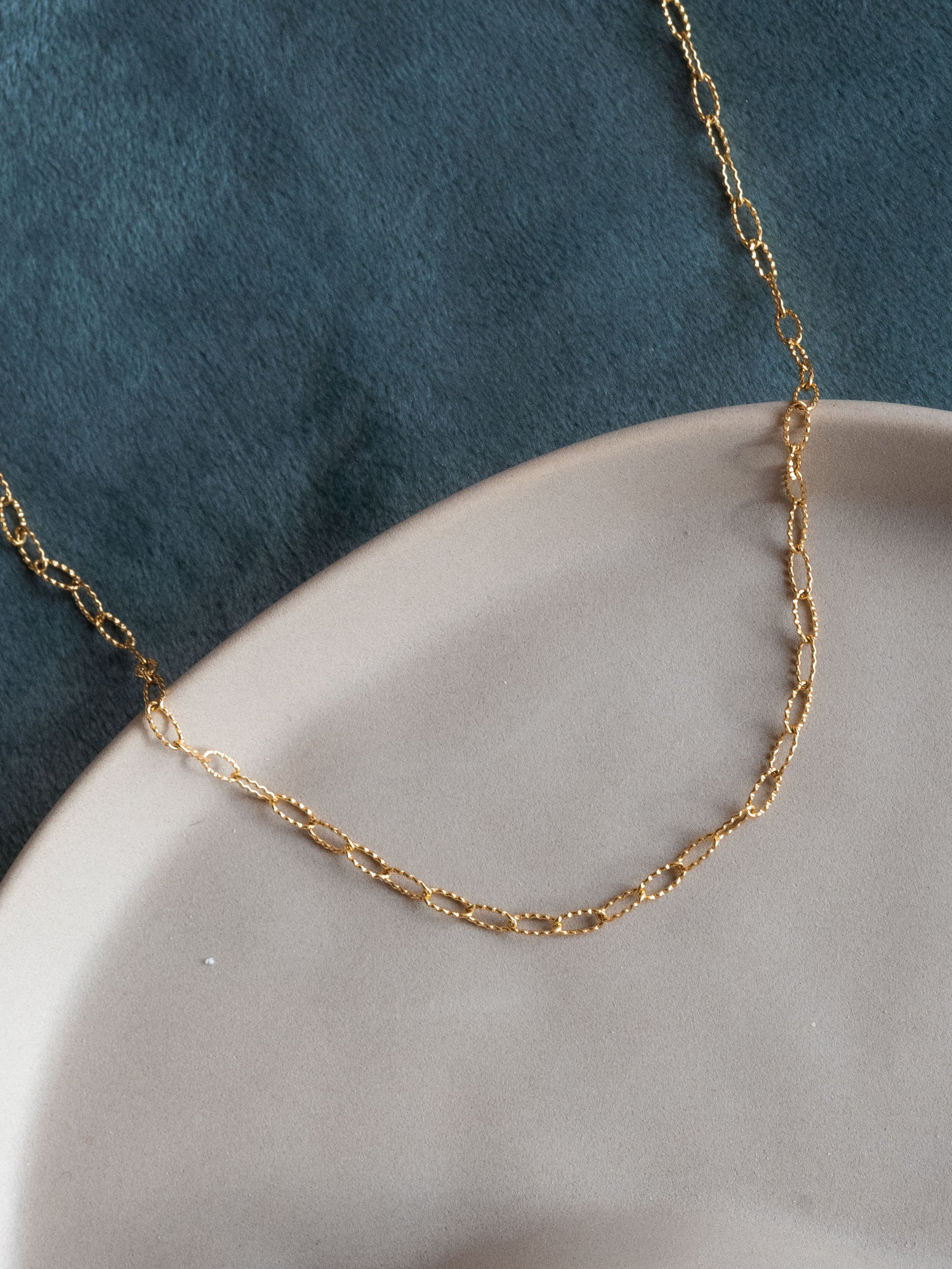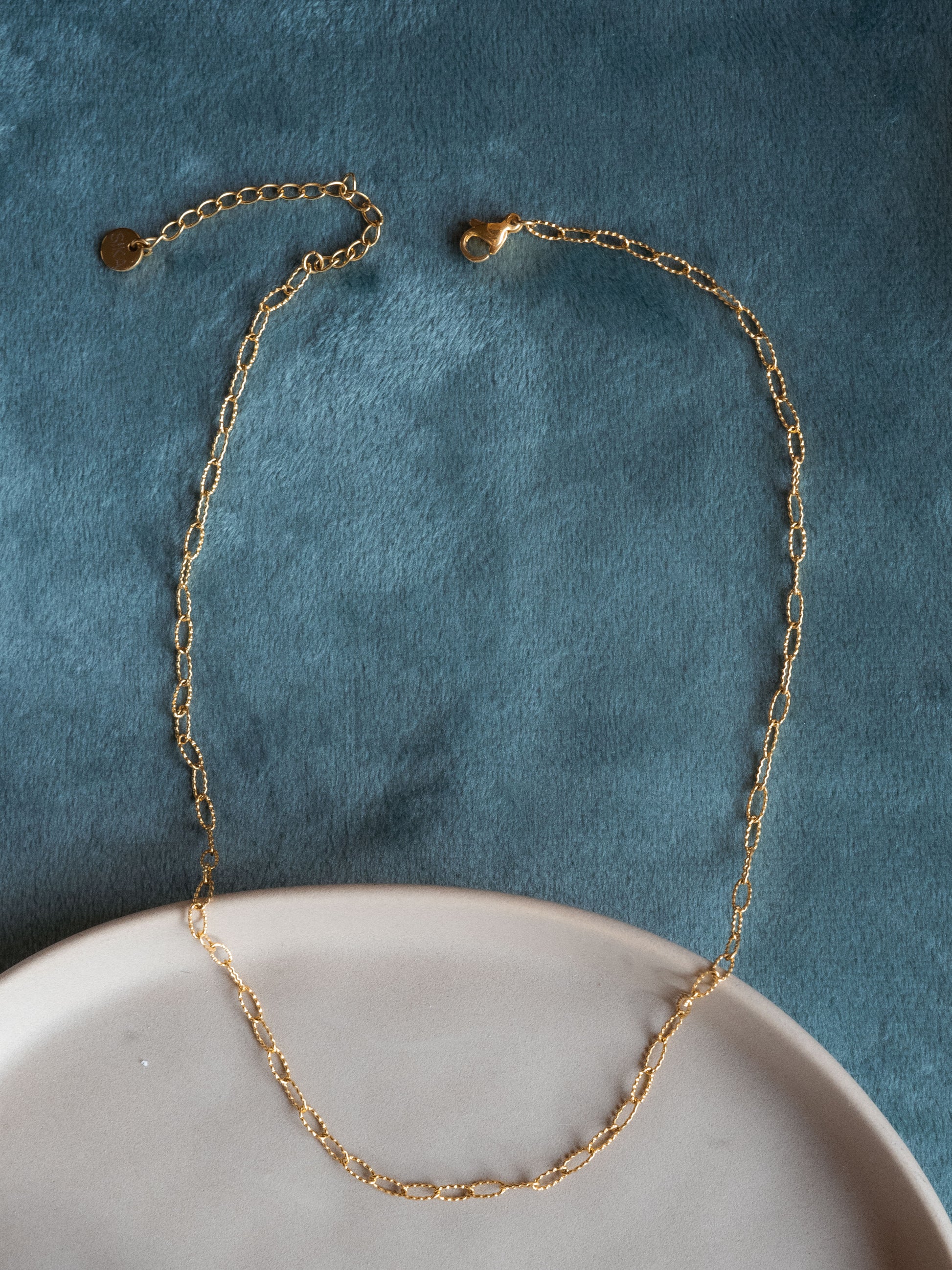 Le ras de cou Gabin est fabriqué à la main dans mon atelier. Il est composé d’une chaîne aux maillons ronds rectangulaires et striés.