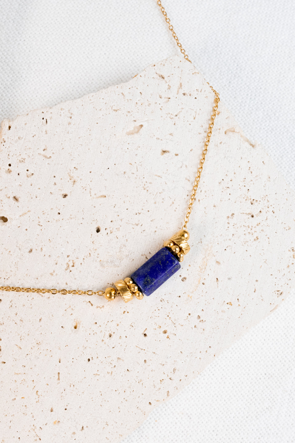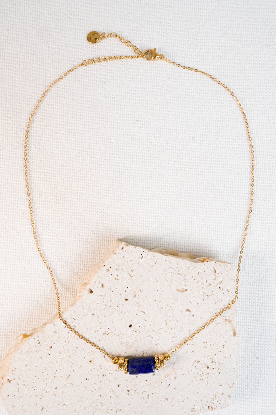 Le collier ras de cou Layla est fabriqué à la main dans mon atelier, Il est monté sur une fine chaîne aux maillons striés et décorée d’une Lapis-Lazuli et de quelques perles dorées,