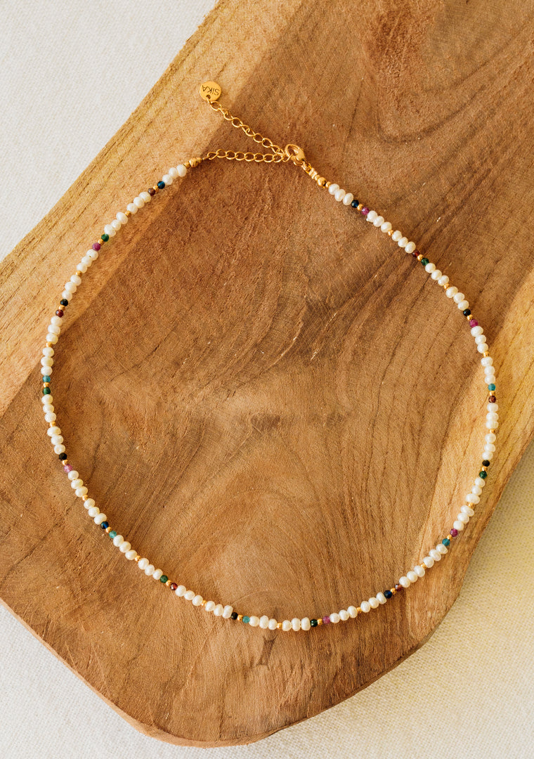 Le collier ras de cou Leïla est fabriqué à la main dans mon atelier, Il est composé de Perles d’eau douce, d’une multitude de pierres semi-précieuses et de quelques perles dorées,