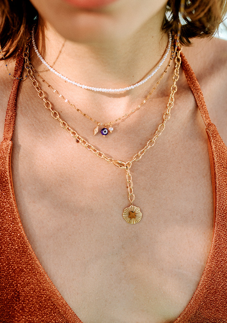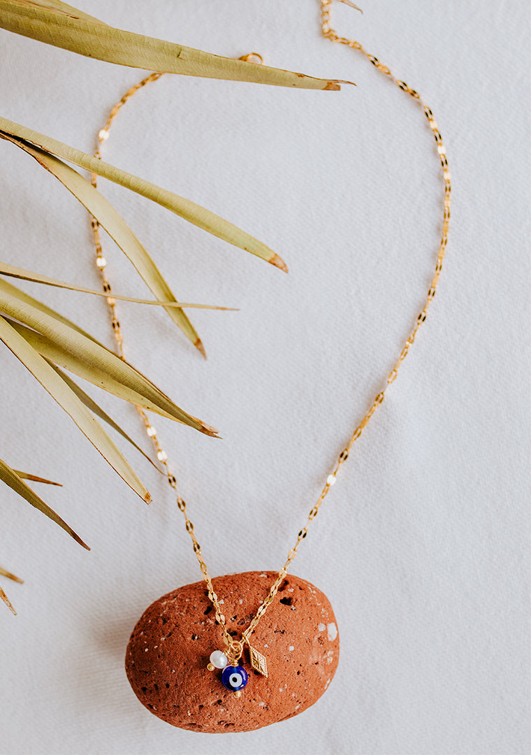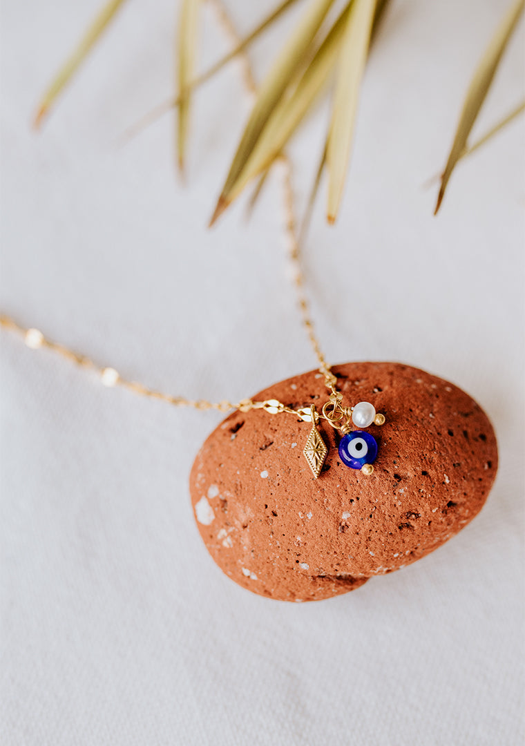 Le collier ras de cou Oja est fabriqué à la main dans mon atelier, Il est monté sur une chaîne fine aux maillons ovales ornée d’une perle d’eau douce, d’un œil grecque et d’une médaille en forme de losange,